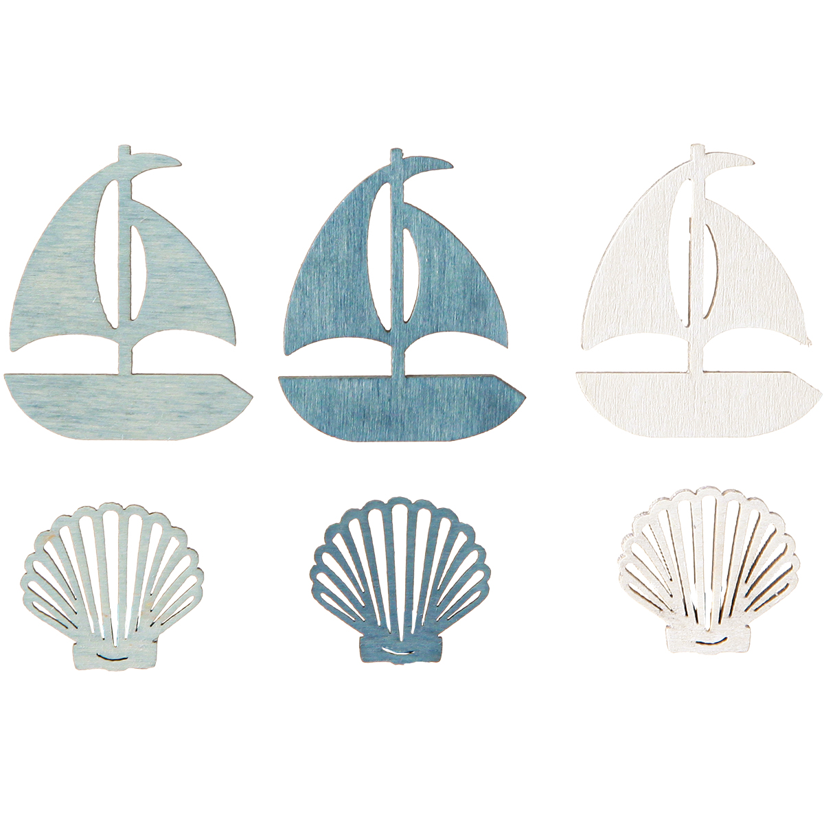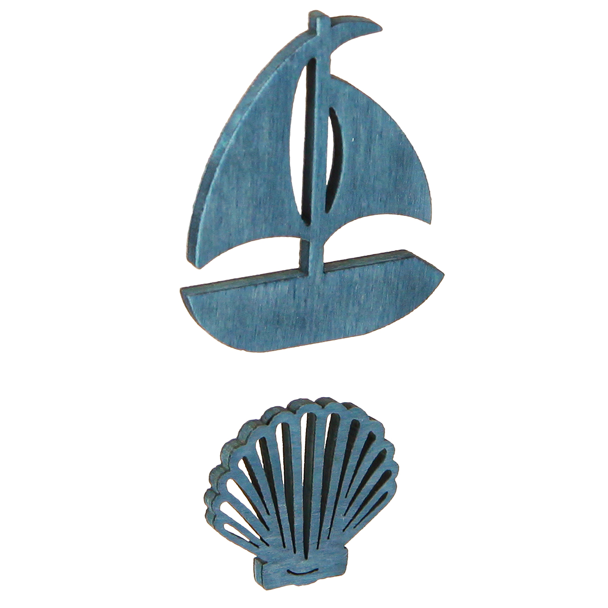 Szórványdarabok fa dekorációs kagylóhajó kék fehér 2,5/4cm 72 db