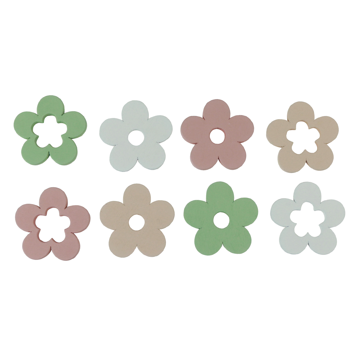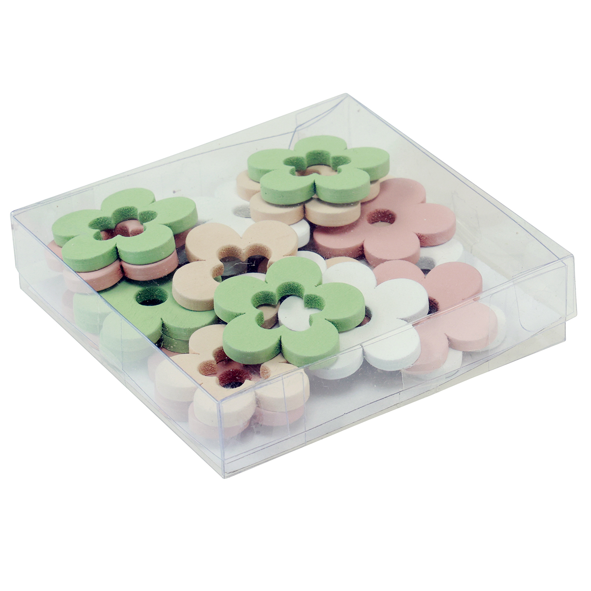A fából készült virágokat szórt dekorációként, körülbelül 24 db-os kiszerelésben kapod fehér, rózsaszín, zöld és sárga színekben.