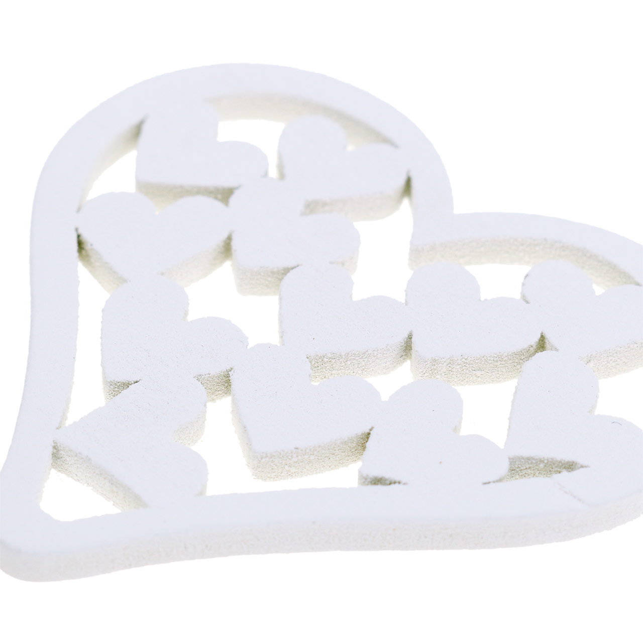 A sok, kicsi szív a nagy összefüggésében nem csupán szimbolikus utalás az ünnepelendő családalapításra, és arra a vágyra, hogy a szeretet szaporodjon és szaporodjon. Emellett rendkívül sokoldalúak. Akár az esküvői asztal dekorációjaként osztja ki a fa szívecskéket, akár a virágkompozícióban kiemeli, akár a helykártyákra rögzíti őket: A fehér szórt dekoráció minden kézműves ötlethez megfelelő. Az áttört keretnek köszönhetően egy fehér cérnával gyorsan vállfává vagy ajándékcédulává varázsolhatja a szétszórt dekorációt. A szív vezérmotívumként végigfut a teljes esküvői dekoráción.