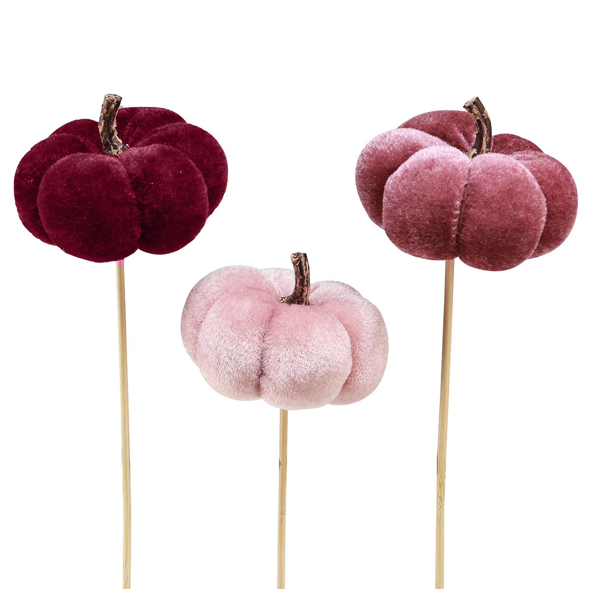 A kiváló minőségű anyag és a bársonyos csillogás plüss megjelenést kölcsönöz ezeknek a sütőtöknek, és tökéletes kiegészítője lehet elegáns ajtókoszorúknak vagy színes őszi csokroknak. A masszív fapálca egyenként is rövidíthető, így gyerekjáték a vázákba, csokrokba, elrendezésekbe helyezés.