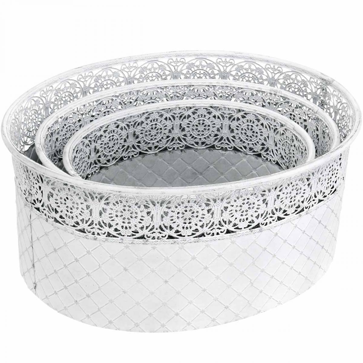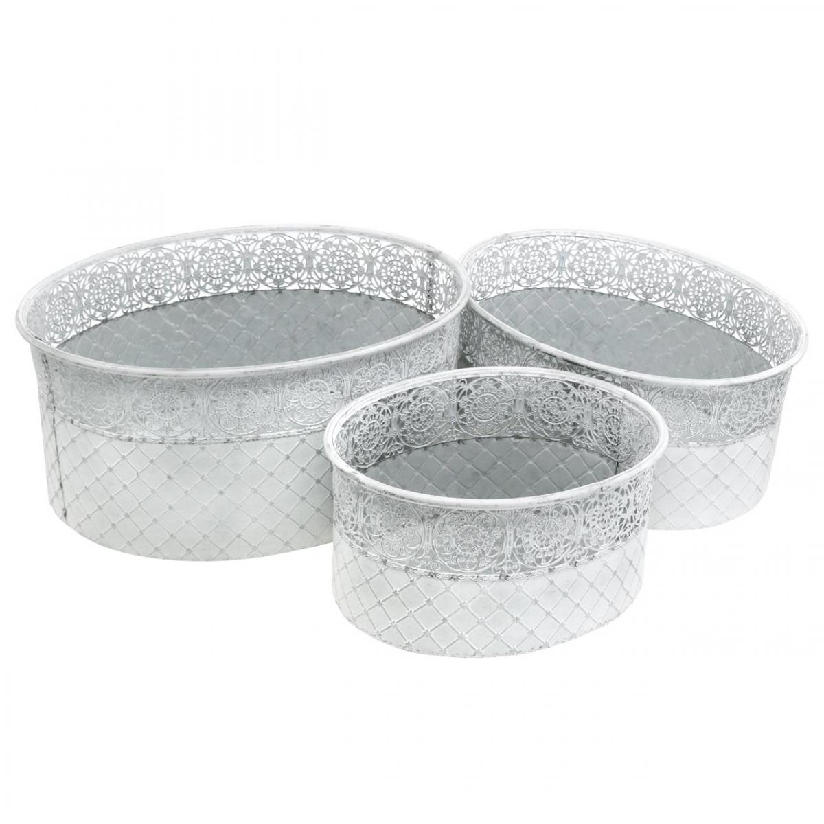 Tál ültetésre, fém edény csipkemintával, dekoratív edény ovális fehér, ezüst shabby chic L41,5/35/29,5 cm H19/16/14,5 cm 3 db-os készlet