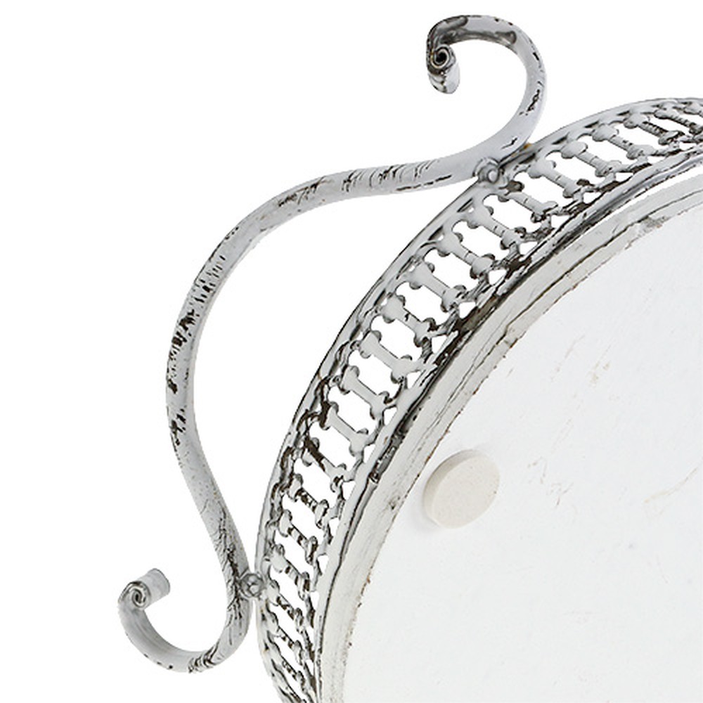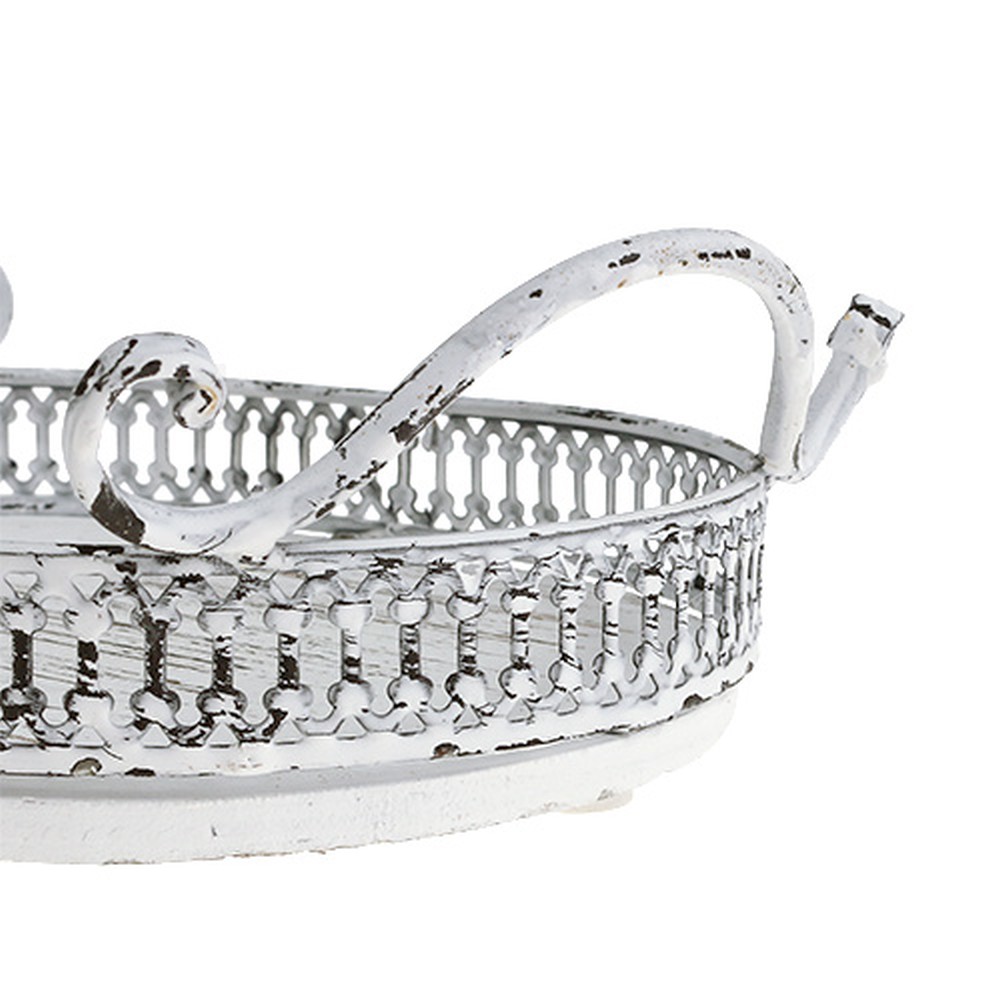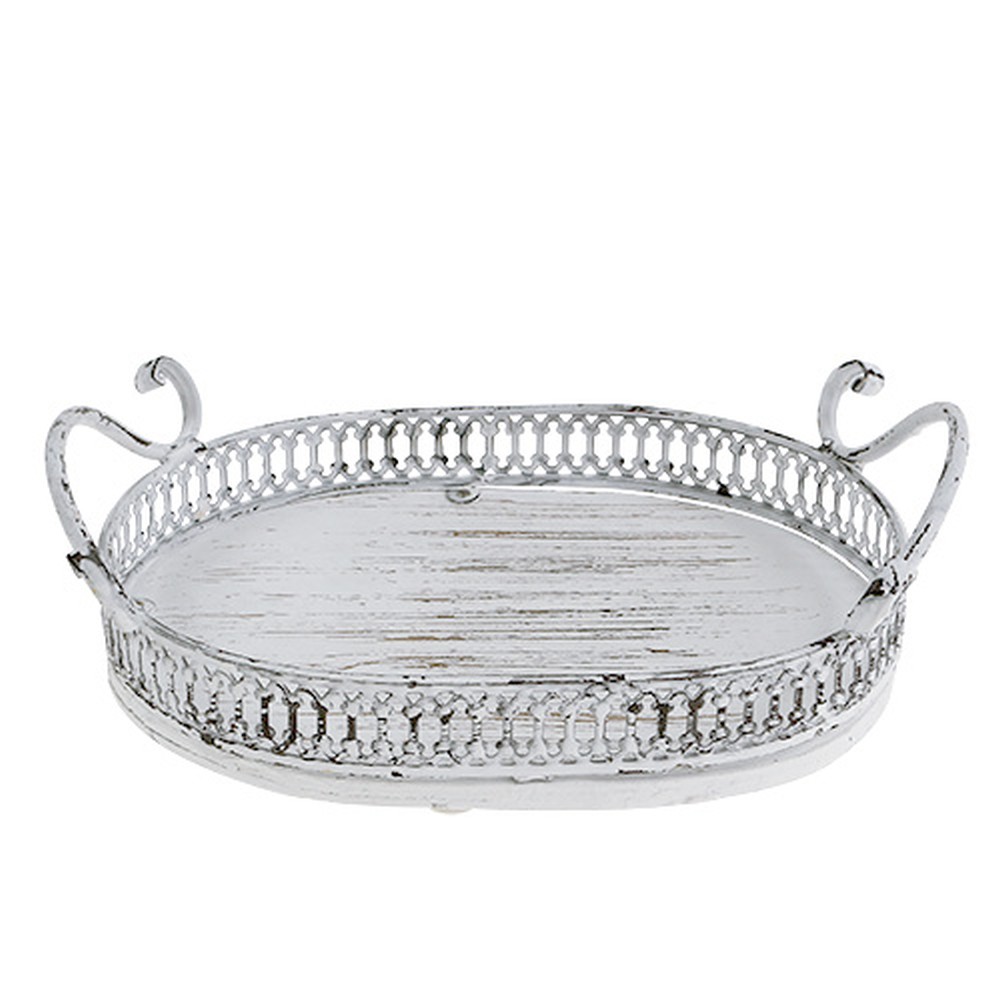 Az ovális tálca fa alappal és fém fogantyús kerettel rendelkezik. Mindkét anyag fehérre van mosva a mesterséges öregedési hatás érdekében. A tálca körülbelül 23 centiméter hosszú, körülbelül 17,5 centiméter széles és a fogantyúkkal együtt körülbelül 7,5 centiméter magas, fogantyúk nélkül 4,5 centiméter.