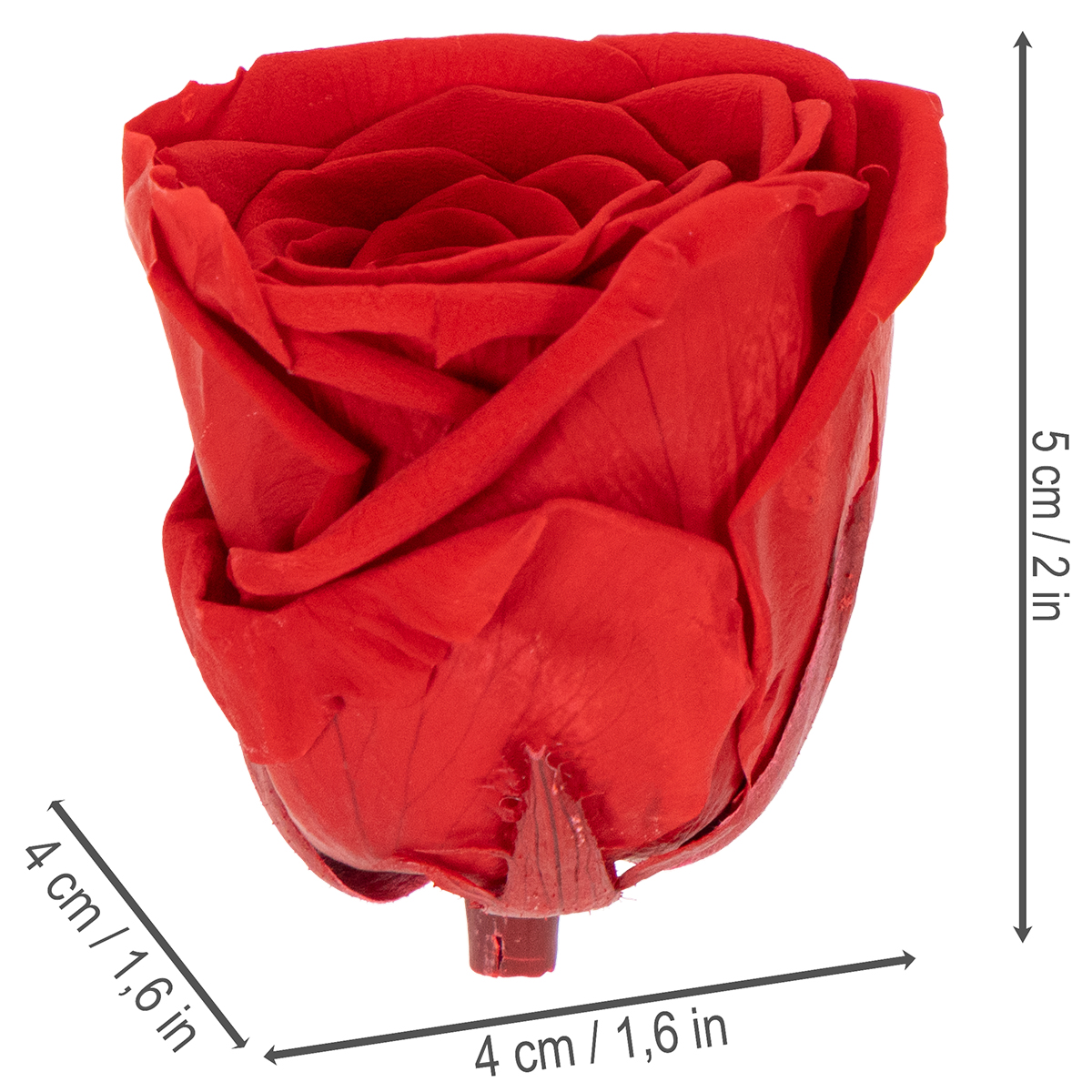 Tartósított rózsáink ragyogó vörös színükkel és kiváló minőségű kidolgozásukkal lenyűgözik a vásárlókat. Minden egyes rózsát gondosan válogatunk és speciális eljárással tartósítunk. Ez biztosítja, hogy a virág megőrizze természetes textúráját és megjelenését – mintha frissen szedték volna. A körülbelül 5 cm magas és 4 cm átmérőjű rózsák tökéletesen arányosak, így eleganciát kölcsönöznek bármilyen dekorációnak.