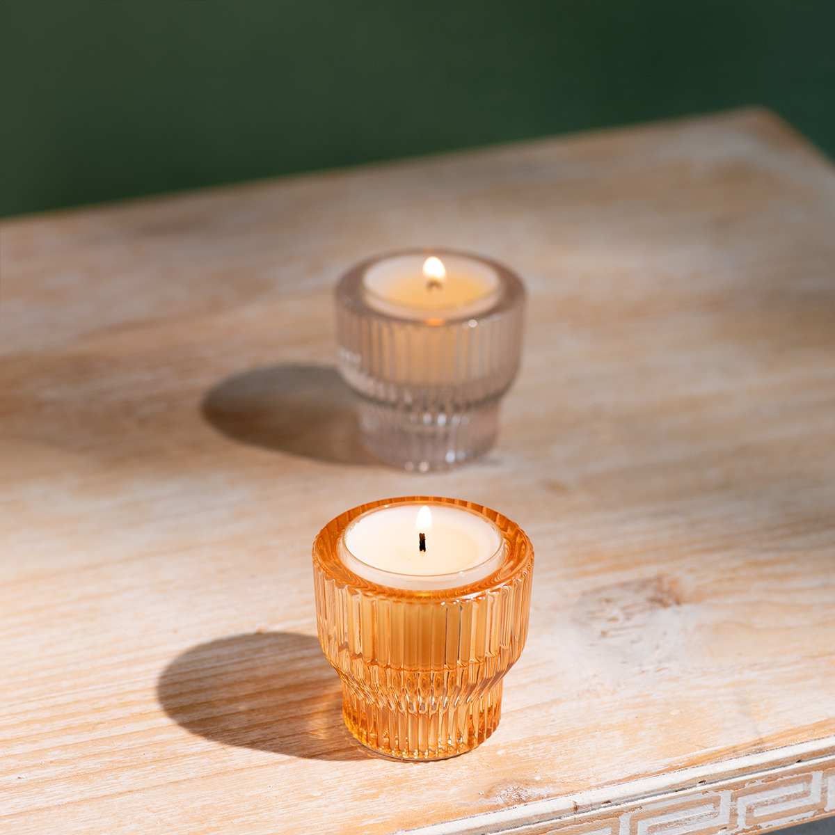 A teamécses-tartók barázdáltak és nosztalgikus megjelenésűek. A színes üvegdísz az alja felé elvékonyodik, hogy keskenyebb alapot képezzen, de minden sík felületen stabil és megbízható marad. A tealámpa pontosan illeszkedik ennek a kis üvegasztaldísznek a nyílásába.