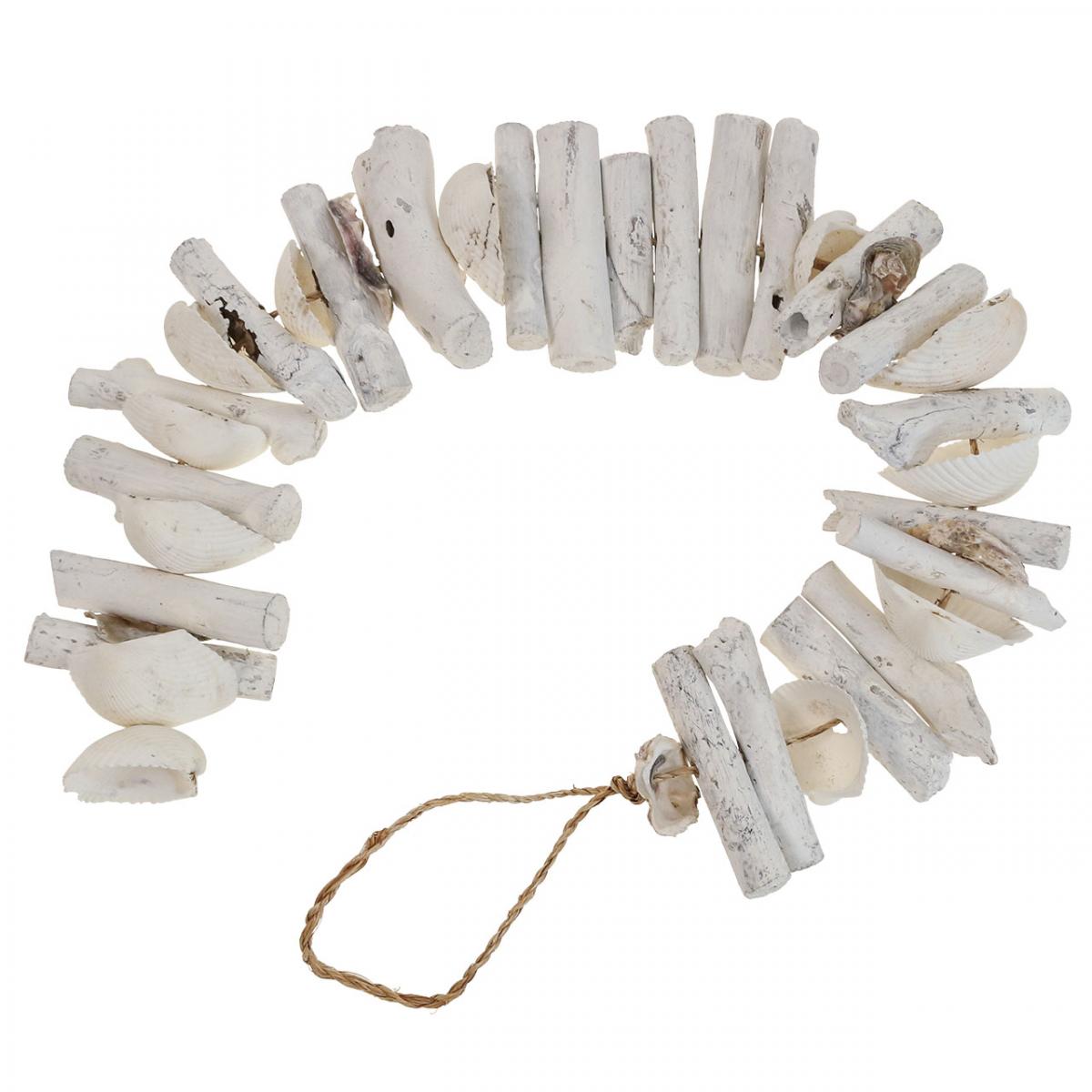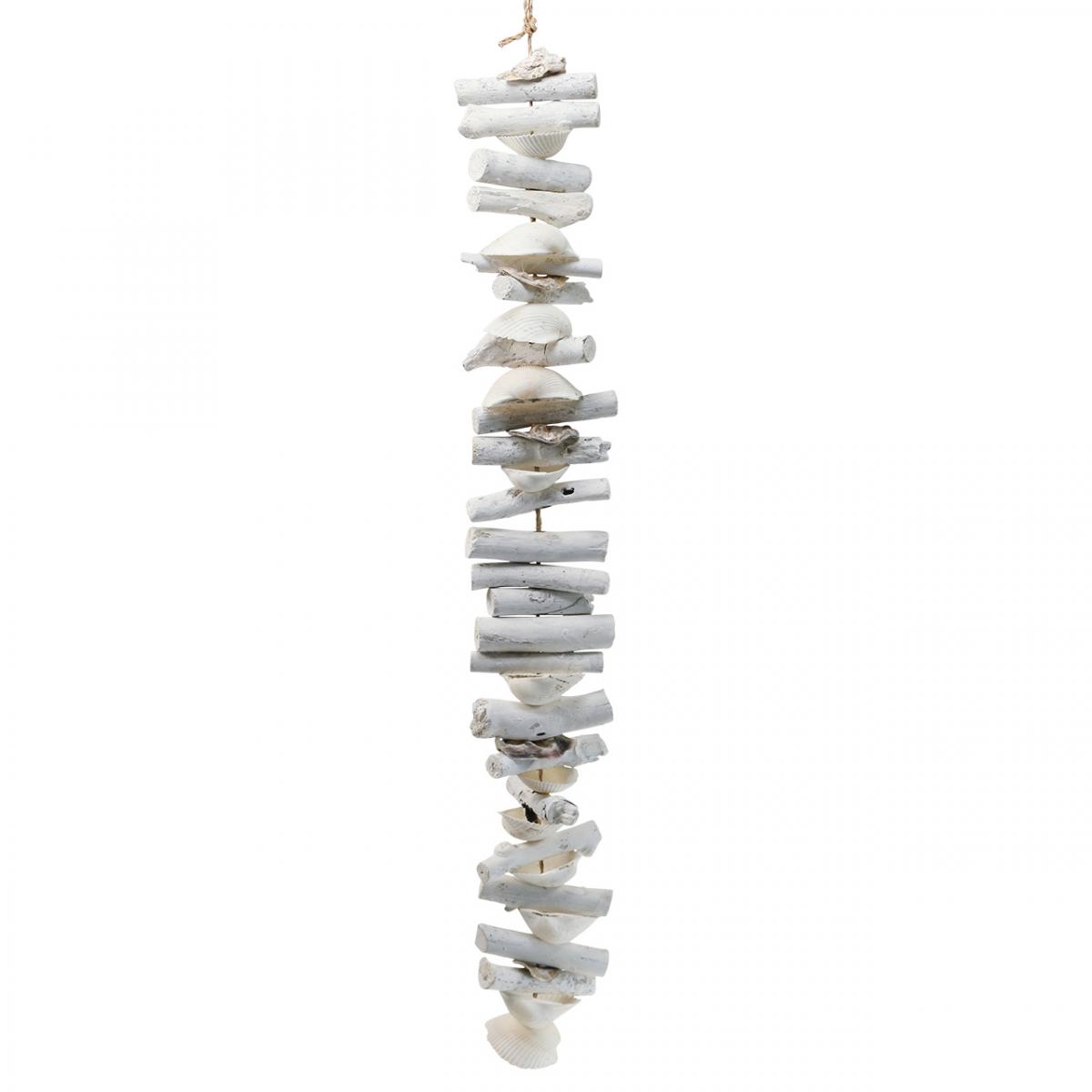 Dekoratívan fehérítve, a tengeri dekorációban a natúr elemek részletei még jobban kirajzolódnak. Az uszadékfa és a kagylók felváltva vannak felfűzve jutaszalag zsinórra, és a felső huroknak köszönhetően felakaszthatók.