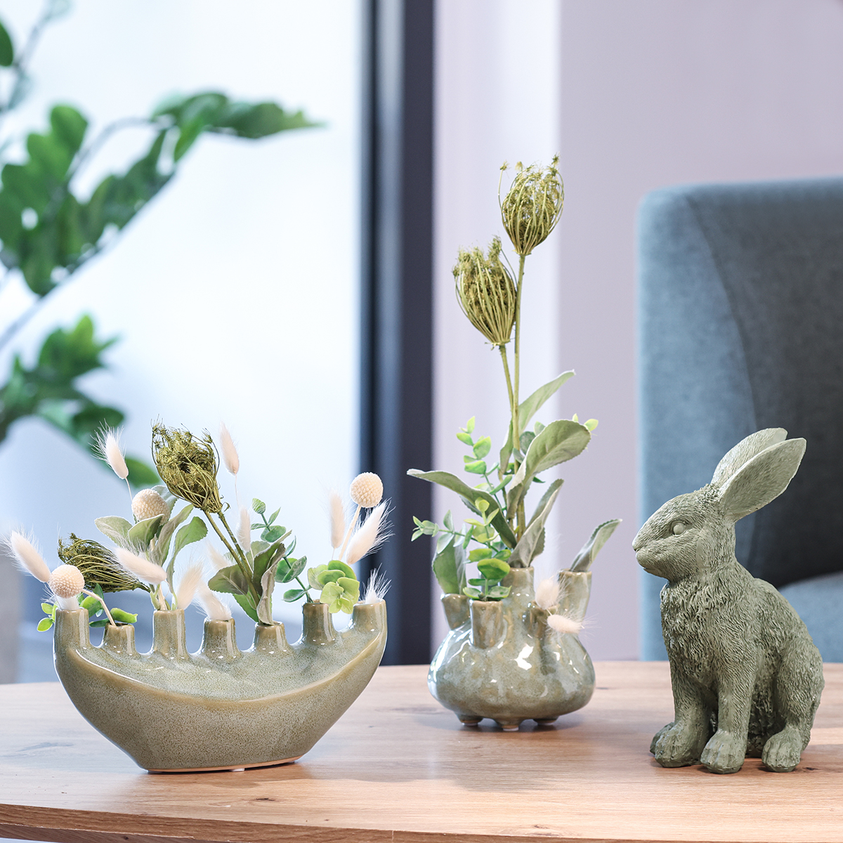 - A harmonikus színösszeállítás érdekében kombinálja a vázát Floristik24 termékcsaládunk más világoszöld vagy természetes színű díszítőelemeivel.