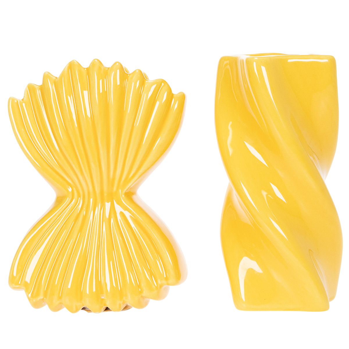 Ezek a dekoratív kerámia vázák első pillantásra lenyűgözőek kivételes dizájnjukkal, melyeket a népszerű olasz tésztafélék játékos formái ihlettek. Tökéletesek az eredeti dekorációk és a modern dizájnerdarabok szerelmeseinek! Az élénk sárga és a részletgazdag dizájn kombinációja stílusos kiegészítővé teszi ezeket a vázákat mediterrán stílusú nappalikba vagy irodákba. Párosítsd ezeket a dizájnerdarabokat egy egyszerű terítővel vagy mediterrán ihletésű dekorációval a harmonikus összkép érdekében.