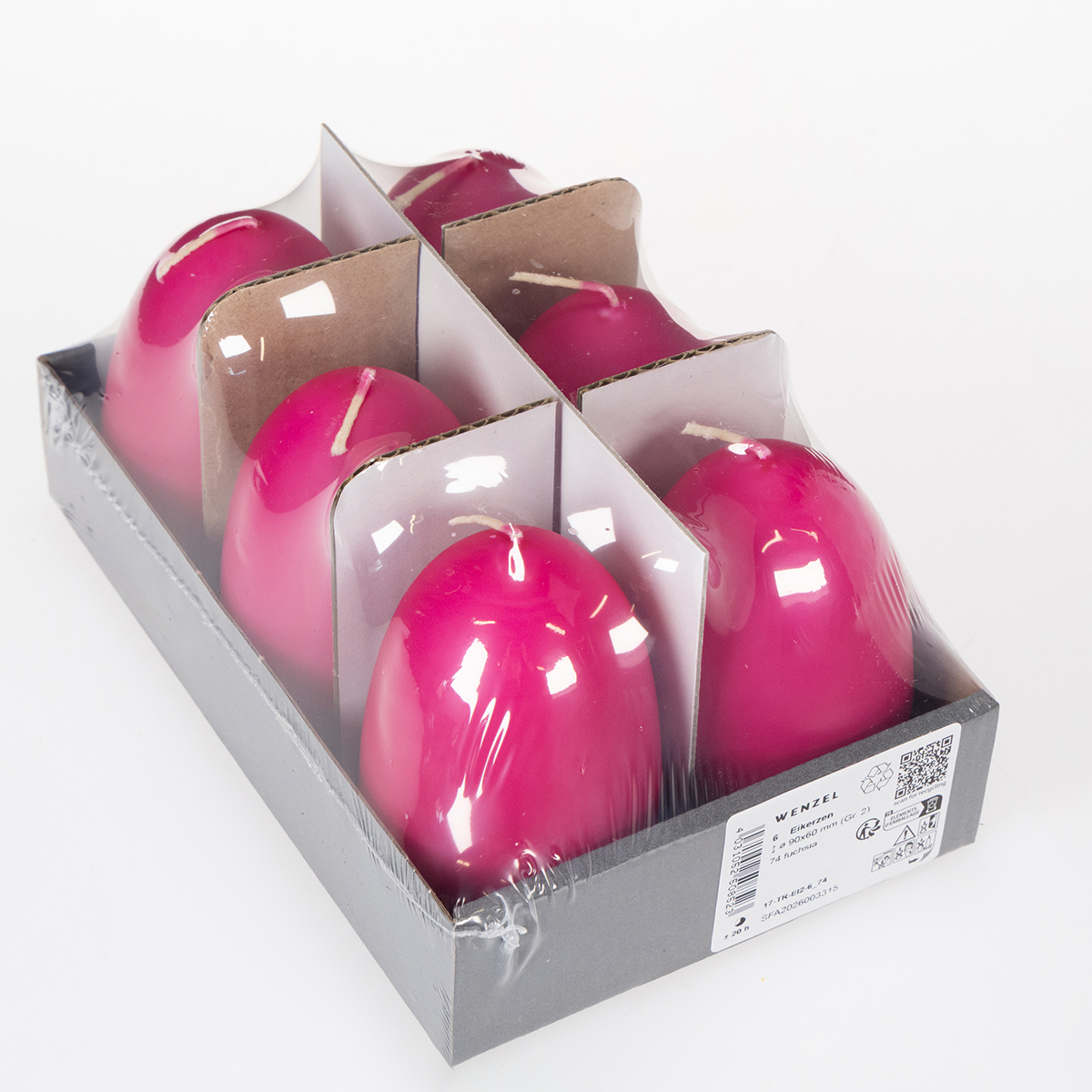 Ez a rózsaszín tojásgyertya a friss színárnyalatokat ötvözi a kiváló minőségű kidolgozással. 9 centiméter magas és 6 centiméter átmérőjű, így tökéletes asztaldísz egy tavaszi asztalterítéshez. Meleg fénye természetes, otthonos hangulatot teremt anélkül, hogy túlzó lenne. Élénk színe ellenére a gyertya nincs teljesen befestve. A felület finom csillogása modern eleganciát kölcsönöz neki, amely szinte bármilyen lakberendezési stílushoz illik. Akár a minimalista skandináv megjelenést, akár a játékosabbat kedveli, ez a rózsaszín húsvéti tojásgyertya színfoltot ad az otthonnak anélkül, hogy feláldozná az időtlenséget. Különösen harmonikus megjelenésért kombinálja a gyertyát pasztellszínű szalvétákkal, friss virágokkal, például jácinttal, vagy apró húsvéti figurákkal. Tipp: Tojásgyertyánk szépen illik ezüst vagy fehér díszítőelemekhez is, egy csipetnyi frissességet adva az egyszerűbb kompozícióknak. Különösen praktikus tulajdonsága: a csomag hat gyertyát tartalmaz, így még a nagyobb dekorációk is gyerekjáték!