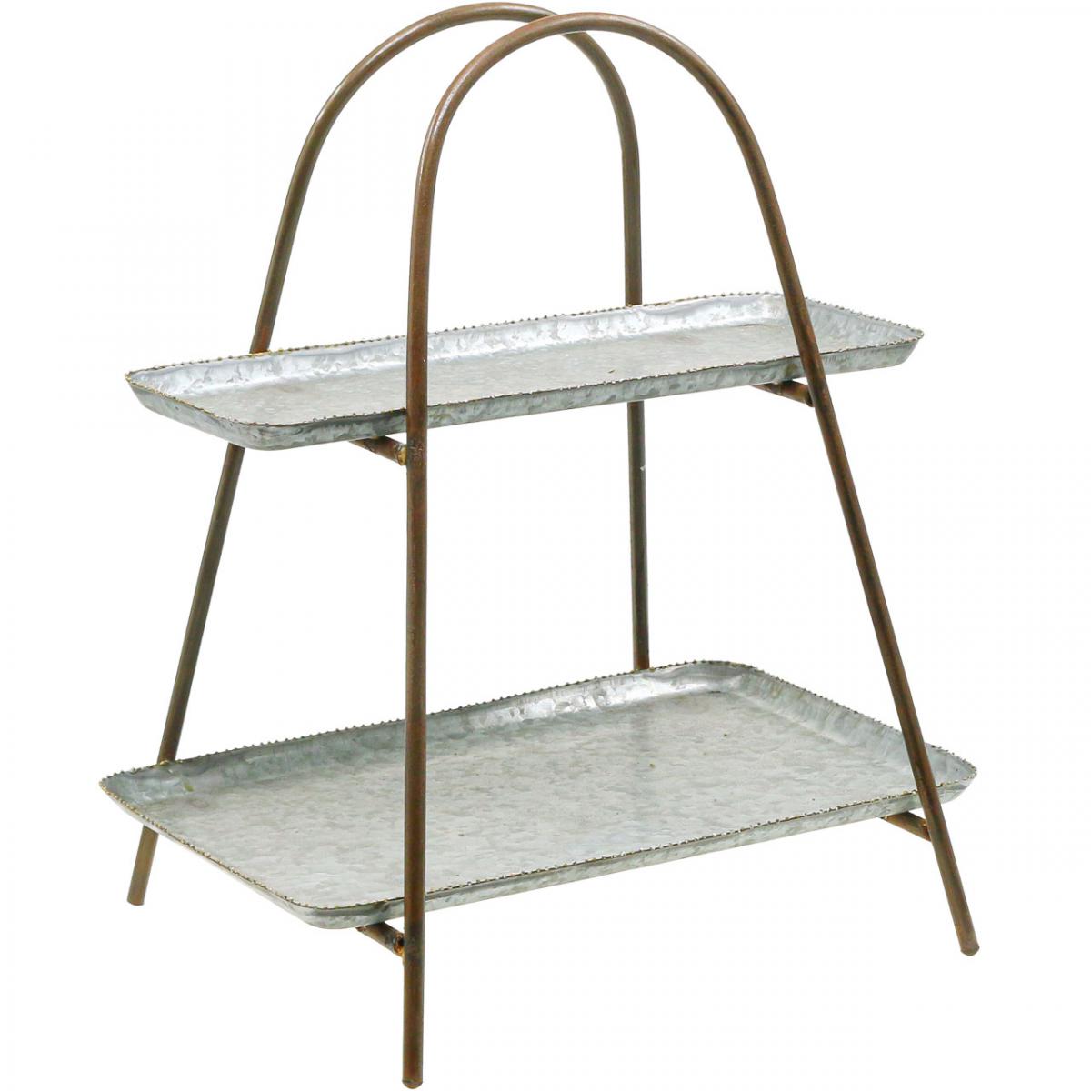 Ez a vintage megjelenésű etagere egy kétszintes dekoratív tálca, amely lehetővé teszi a cserepes növények elegáns megjelenítését. A formás fémdekoráció nem hagy kívánnivalót maga után, különösen, ha dekorációs lehetőségekről van szó.