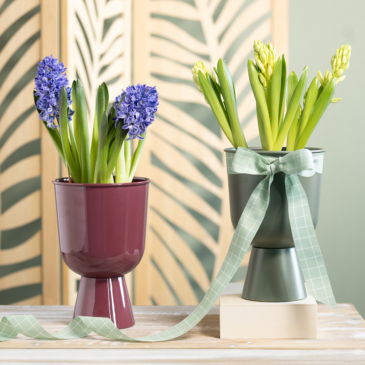 Ez a kehely alakú váza bájosan ötvözi a formát és a funkciót. 23 cm magas és 16 cm átmérőjű, így bőséges helyet kínál nagyobb virágdíszeknek vagy szokatlan dekorációknak. A matt zöld fém test elegáns megjelenést kölcsönöz neki, amely szépen kiegészíti a modern belső stílusokat, például a skandináv eleganciát vagy a minimalista dizájnt. A meghittebb hangulatért párosítsa ezt a vázát földszínekkel vagy meleg fa elemekkel.