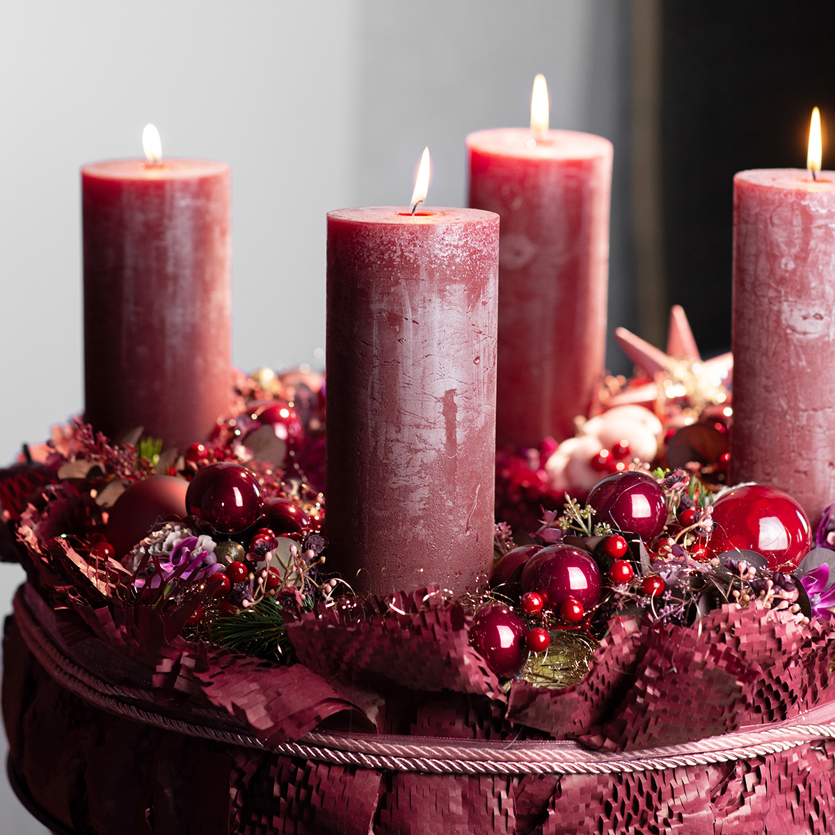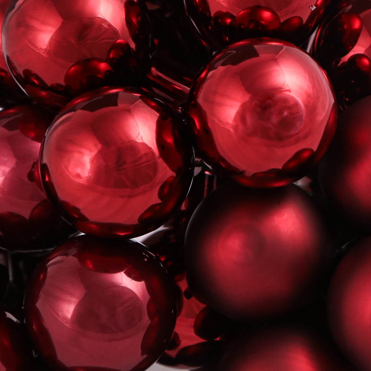 A matt és fényes bordó és piros tükörbogyók zöld kézműves dróthoz vannak rögzítve, és több csokorba csoportosulnak. Összesen körülbelül 140 darabot tartalmazó dobozban szállítják őket, amelyek átmérője körülbelül 20 milliméter.