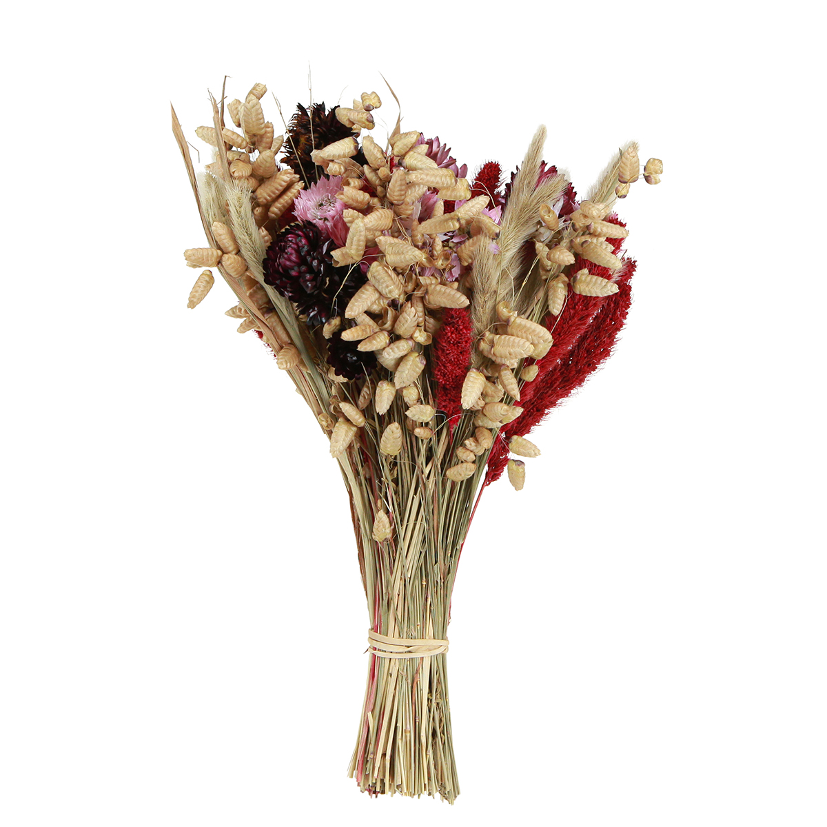 A szárított virágcsokor többek között gabonából, színes kölesből, rózsaszín szalmavirágból és remegő fűből áll.