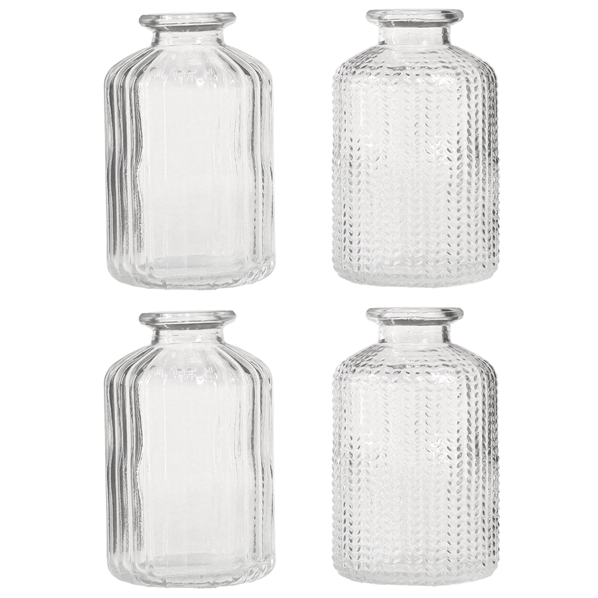 Mind a négy dekoratív üvegpalackváza ideális stílusos virágtartónak és bájos retro mini vázának. Elegáns átlátszó megjelenésűek, mindegyik vonzó méretarányú vagy barázdált díszítéssel tökéletesen illeszkedik bármilyen lakberendezési stílushoz. Legyen szó bohóról, vidéki házról vagy kopott sikkeről, ezek a kis üvegvázák elbűvölő hangsúlyt kölcsönöznek a belső térnek, mint vintage otthoni kiegészítők.