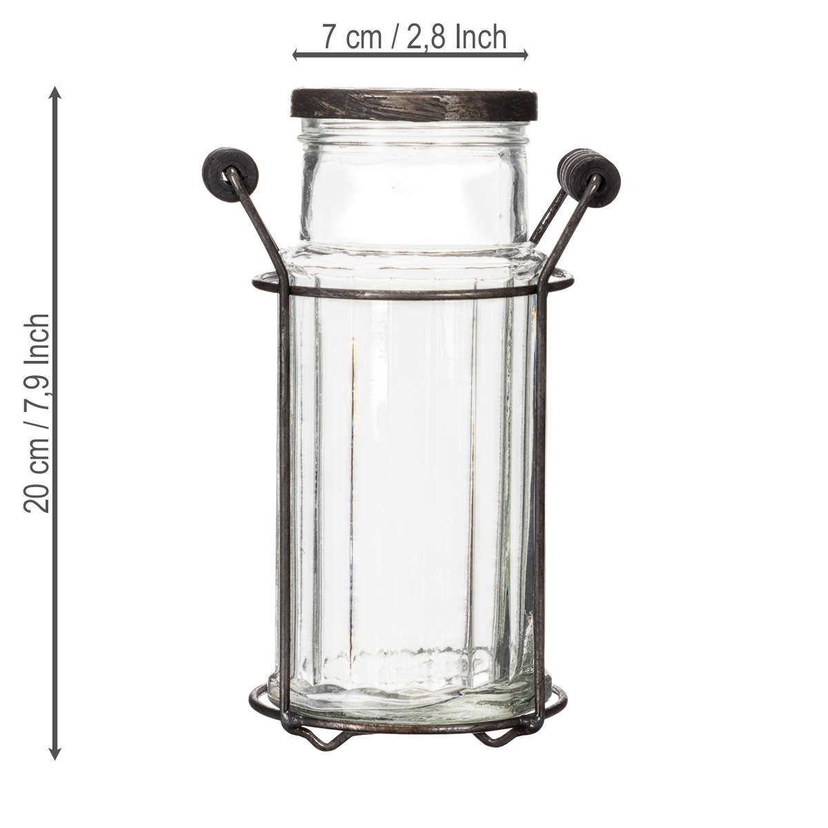 Az üveg és a fém kombinációja ipari eleganciát visz otthonába, míg a finom kidolgozás klasszikus tekintetet vonz. Kiváló minőségű üvegből és masszív fémkeretből készült, ez a palack nemcsak vizuálisan, hanem tartósságával is lenyűgöző. A kis nyílásokkal ellátott fedél különösen sokoldalúvá teszi: használható vázaként egyetlen virághoz, dekoratív konyhai eszköztartóként, vagy akár kreatív gyertyatartóként is. Akár a nappaliban, a konyhában vagy a folyosón – ez az üvegpalack bárhol megtalálja a helyét.