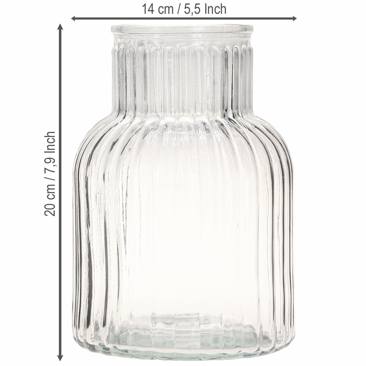 A stílusos retro dizájnú üvegváza tökéletes szemet gyönyörködtető minden nappaliban. Körülbelül 13,5 cm átmérőjével és körülbelül 20 cm magasságával elegendő helyet kínál a legszebb virágdíszek számára. Az átlátszó üveg elegáns átlátszóságot kölcsönöz a vázának, amely gyönyörűen mutatja be vágott virágait, művirágait vagy szárított virágait. A stílusos barázdált kialakítás kiemeli a vintage megjelenést, és sokoldalú dekorációs tárggyá teszi a vázát. Akár asztaldíszként a nappaliban, akár elegáns szemet gyönyörködtetőként az esküvőkön, vagy akár az egész éves lakótér kialakításának részeként – ez az üvegváza kiváló választás. Kombináld a vázát a Floristik24 egyéb üvegdíszeivel, hogy harmonikus összképet alkoss, amely minden helyiséget kiemel. A robusztus üveg tartósságot és könnyű tisztítást biztosít, így sokáig élvezni fogja ezt a terméket.
