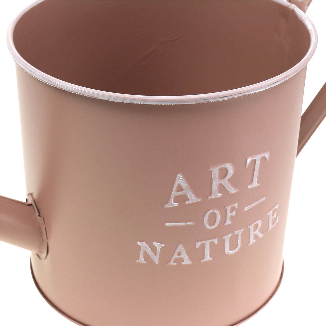 A halványrózsaszín öntözőkanna formájú, fehérre mosott feliratú cink virágcserép belső átmérője 16,5 centiméter körüli, kívül fél centivel több. A virágcserép magassága körülbelül 17 centiméter. A fogantyúval és kifolyóval együtt a dekoratív öntözőkanna teljes hossza körülbelül 45 centiméter.