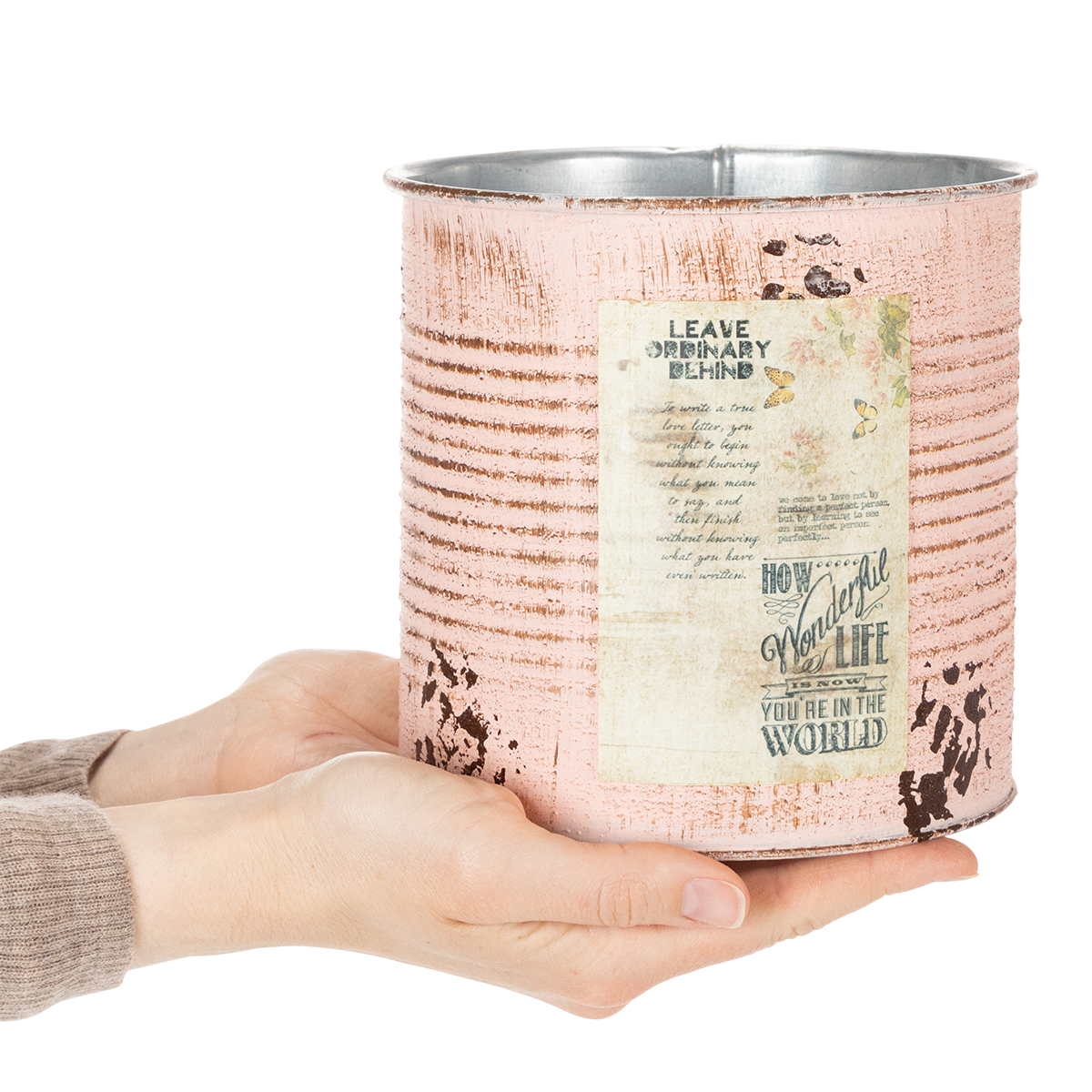 Ez a lazac színű díszdobozból készült virágcserép színesíti a nyarat! Igényesen rozsda spray-vel és kiválasztott pasztell színnel festett fém edény cachepotként vagy ültetőként is használható. A vintage matrica kiemeli a konzervdoboz kifinomult, nosztalgikus megjelenését. Az, hogy a fémdísz valójában vadonatúj, csak az ezüst színű belsejéből látszik. Ennek a kifejezetten ültetőgépnek készült doboznak természetesen nincs éles széle a belsejében.