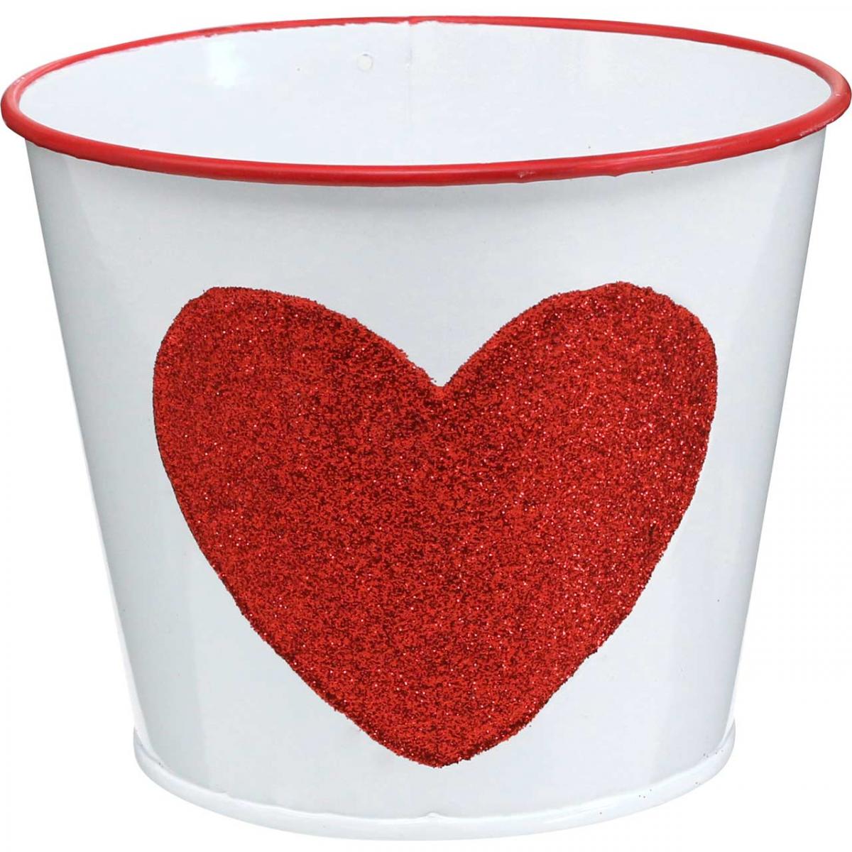 Csinos kis virágcserép klasszikus dizájnnal. A fehér bádogvödör csésze alakú, piros pereme és piros szív alakú.
