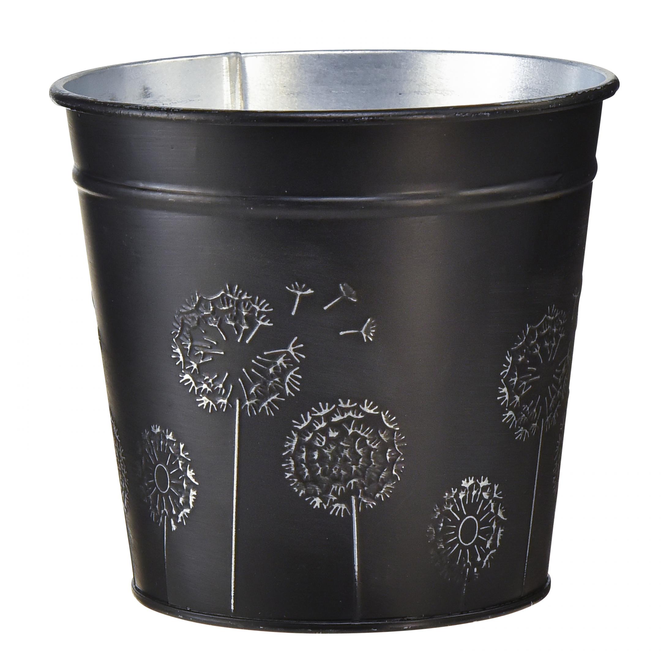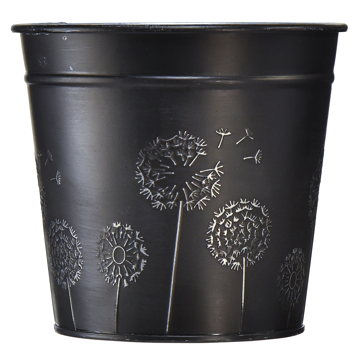 Ez a fekete virágcserép ezüst színű díszítéssel rendelkezik, amely nyári érzést kelt. A pitypang különböző méretű és állapotú. Néhány esernyő pedig máris új célpontok felé repül.