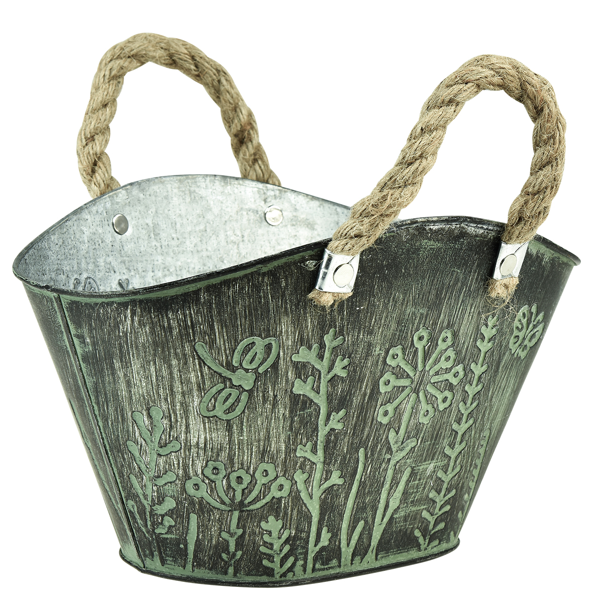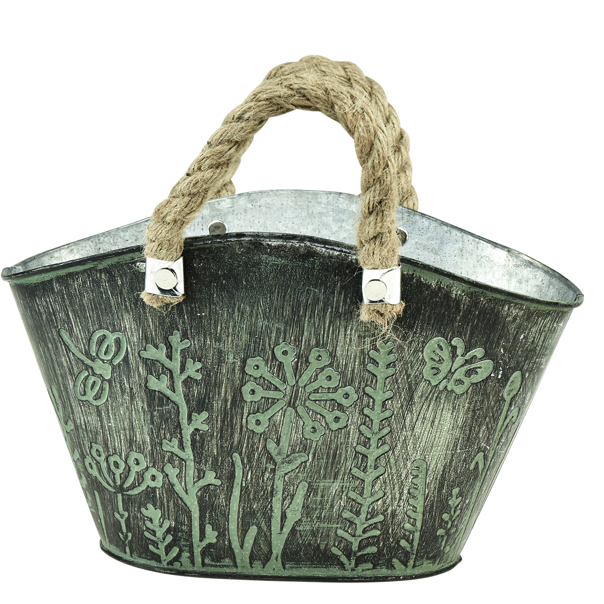 A virágtartó szőtt bevásárlótáska alakú, és nagyon nyugodtnak tűnik. Kívülről a fém cserepet zöld és sötétszürke színnel kezelték, megjelenését stilizált vadvirágos rét jellemzi. A természetes szálból készült fonott fogantyúk megteszik a többit, hogy az ovális virágcserép egy egészen különleges darab legyen.
