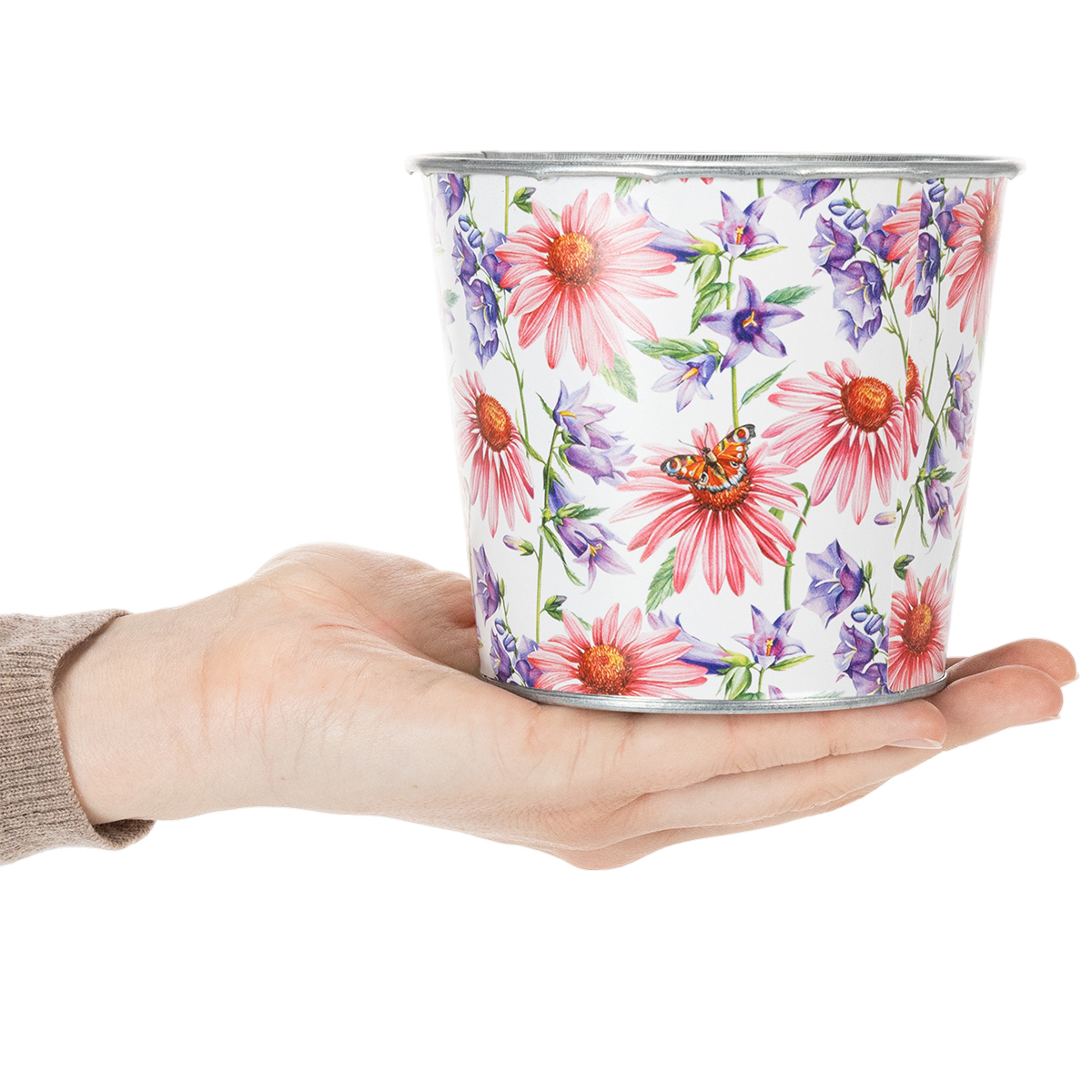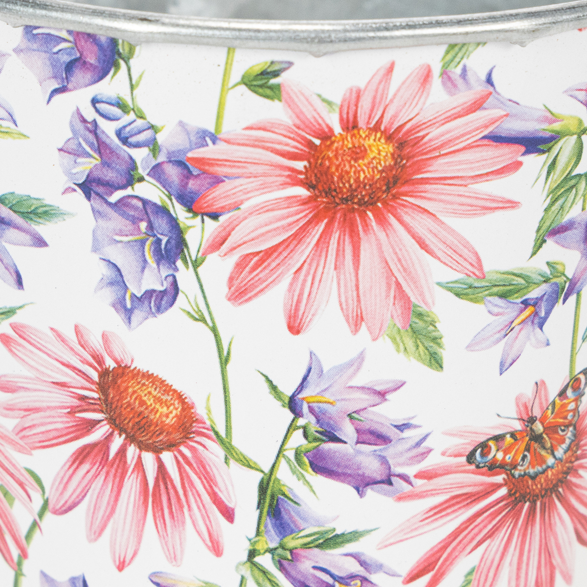 Minden virág virágzik ebben a gyönyörűen nosztalgikus virágcserépben, tavaszi dekorációnak! A fém ültetőn tavaszi üde motívum látható napkalappal és haranggal.