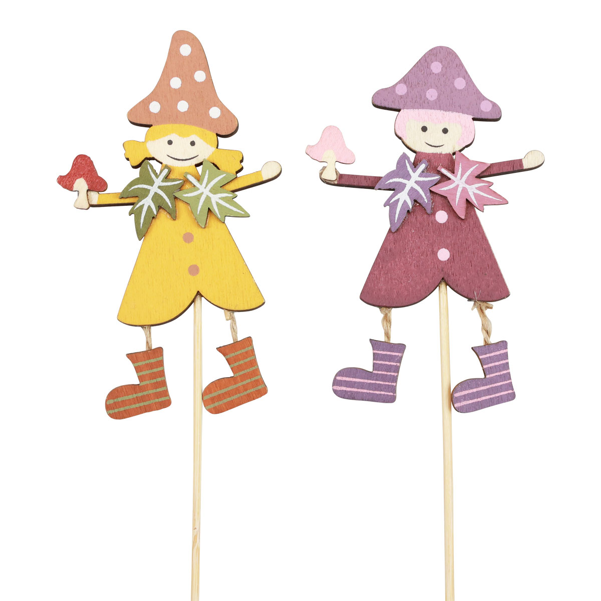 A vidám figurával ellátott növényi karó színesen festett és számos részlettel díszített. A kis őszi figura csíkos csizmája, amely egy madzagról lelóg, különösen ügyes. Az őszi dekoráció hátoldala természetes színű marad. A fapálcát lerövidítheti koszorúhoz, vagy hosszan beleszúrhatja egy virágcserépbe.