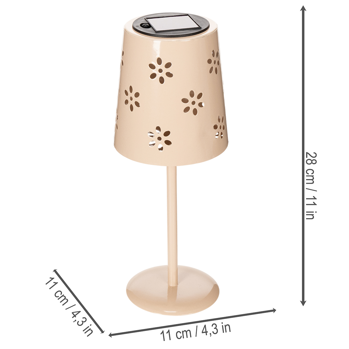 Ez a kültéri napelemes lámpa igazi sokoldalú eszköz. 28 cm magas, bájos dizájnja bármely sarkot feldob – legyen az egy kerti asztal, egy lépcsőforduló vagy egy alacsony fal a kültéri térben. A meleg fehér LED-es fény hangulatos, tükröződésmentes, mégis elég erős megvilágítást biztosít ahhoz, hogy kellemes hangulatot teremtsen. A robusztus fémből készült, kiváló minőségű konstrukció és a gyönyörű bézs-rózsaszín felület tartós dekorációs darabká teszi.