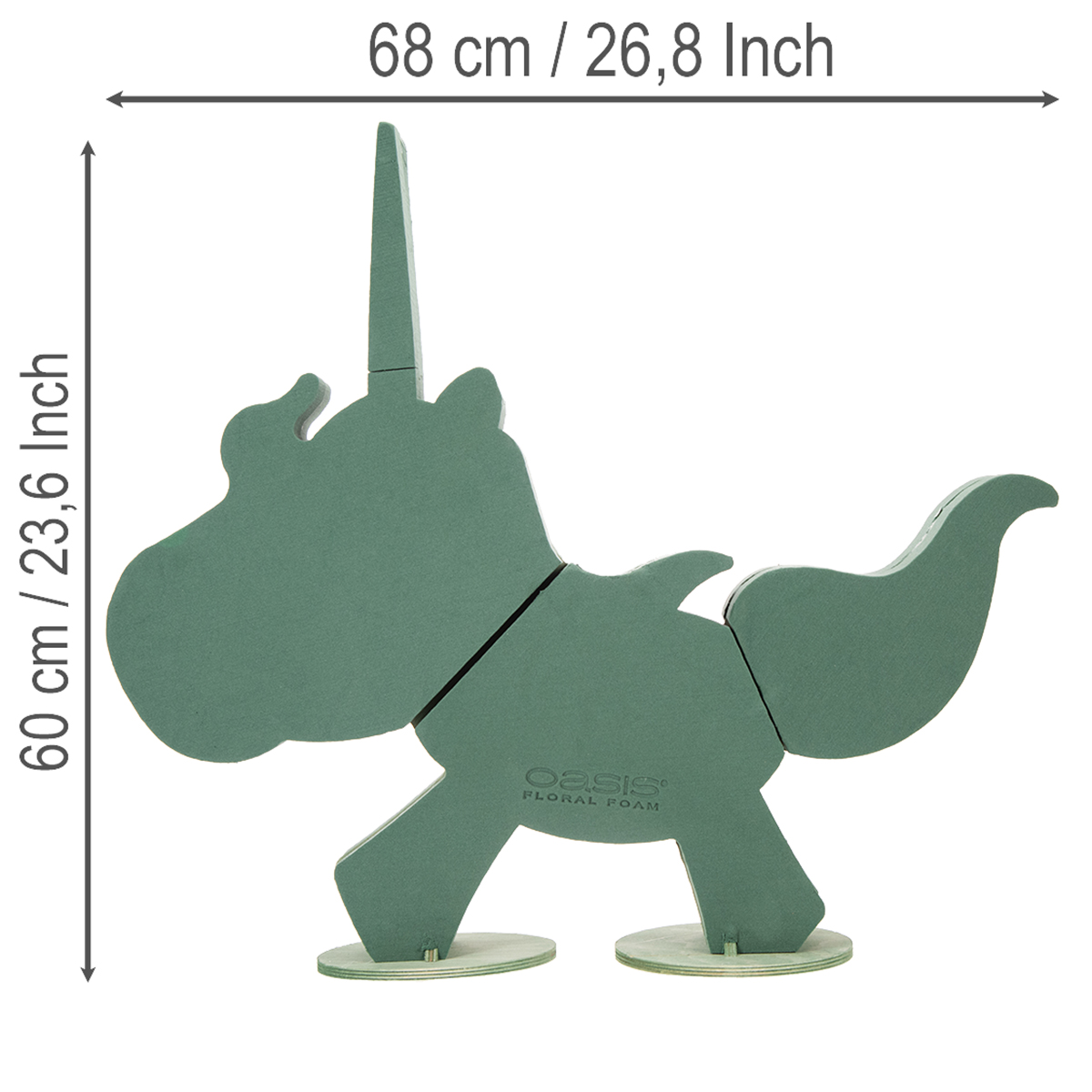 Szerezd meg a divatos egyszarvút. Teremtsen elbűvölően eredeti hangulatot a következő buliján vagy rendezvényén! Az OASIS® BIOLINE® sorozat egyszarvúja főleg zöld nedves virágos habból áll. Két erős, zöld fa alátéten áll. A nagyon környezetbarát virágos hab vágóvonalakkal van ellátva. Ezek minimalizálják a kiszáradást.