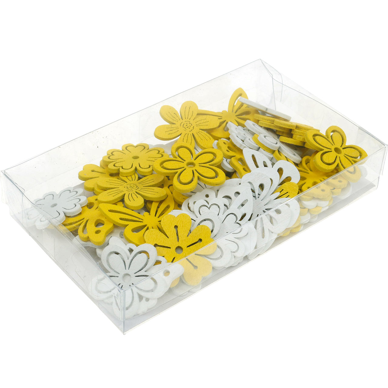 Termék neve: Virágok és pillangók szóráshoz sárga, fehér fa szórt dekoráció tavaszi dekoráció 72 db