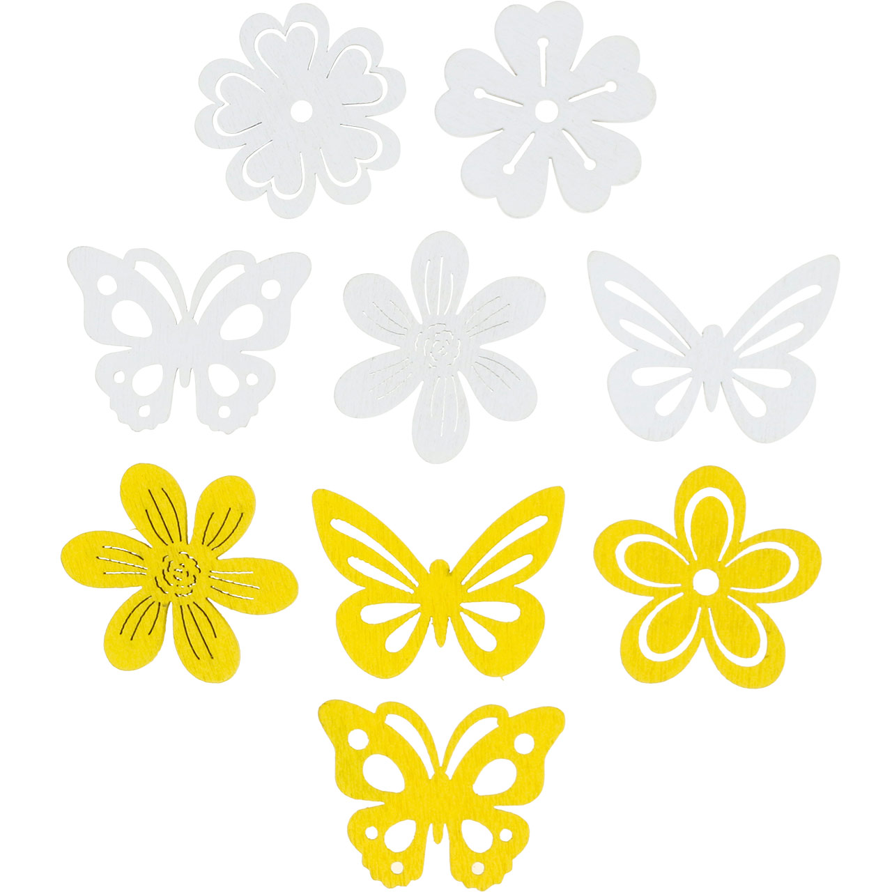 Virágok és pillangók szóráshoz sárga, fehér fa szórt dekoráció tavaszi dekoráció 72 db