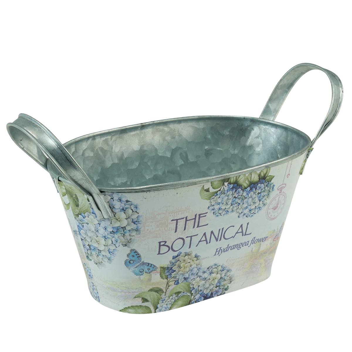 A fogantyúkkal ellátott fém virágtál, kék hortenzia részletes nyomatával egy álomszép virágoskertbe repít.