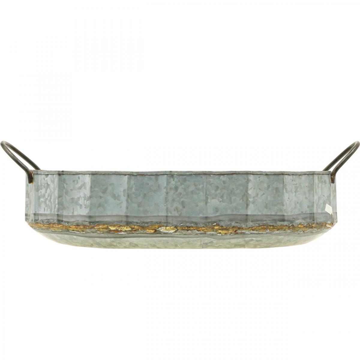 Ez a cink tál kifejezetten antiknak tűnik. A széle úgy van kialakítva, mintha lamellákban lenne kialakítva. A fém virágtálban lévő mesterséges rozsdafoltok hangsúlyozzák a nosztalgikus varázst. A két fogantyú tökéletessé teszi az antik megjelenést.