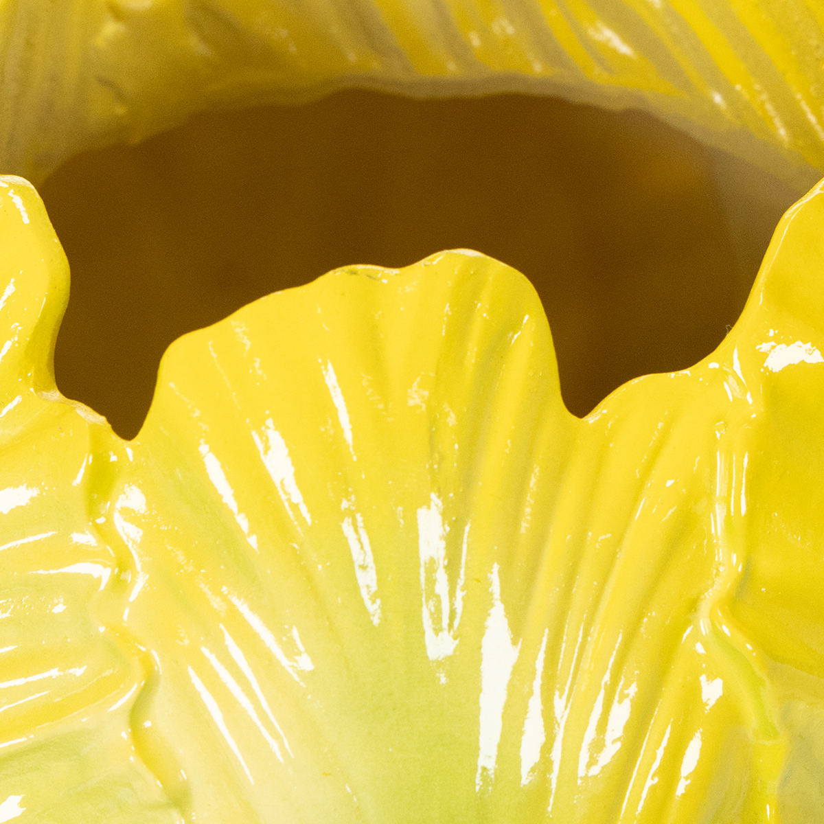 Ez a váza több mint virágok otthona – egy dizájndarab, amely harmonikusan illeszkedik bármilyen élettérbe. Feltűnő formája egy virágzó tulipánra emlékeztet, finoman megformált, szétterülő szirmai élénk sárga és zöld színátmenetben. Ez természetes, mégis modern megjelenést kölcsönöz a vázának. Praktikus: a poligyantából készült váza tartós és könnyen kezelhető. Akár friss tulipánokat, illatos jácintokat vagy finom ágakat rendez el, a váza harmonikus környezetet biztosít. Különösen lenyűgözően mutat más, azonos színpalettájú kiegészítőkkel, például pasztellszínű szalvétákkal vagy finom tavaszi illatú gyertyákkal kombinálva. Tipp: Ez a vázakészlet kiváló ajándék is. Egy színes virágcsokorral ajándékozva garantáltan nagy hatást fog kelteni. A visszafogottabb megjelenésért a vázát megtöltheti szárított virágokkal vagy virághabbal díszített művirágokkal, vagy akár ültethet valami mást is. Így stílusos dekorációt kap egész évre.