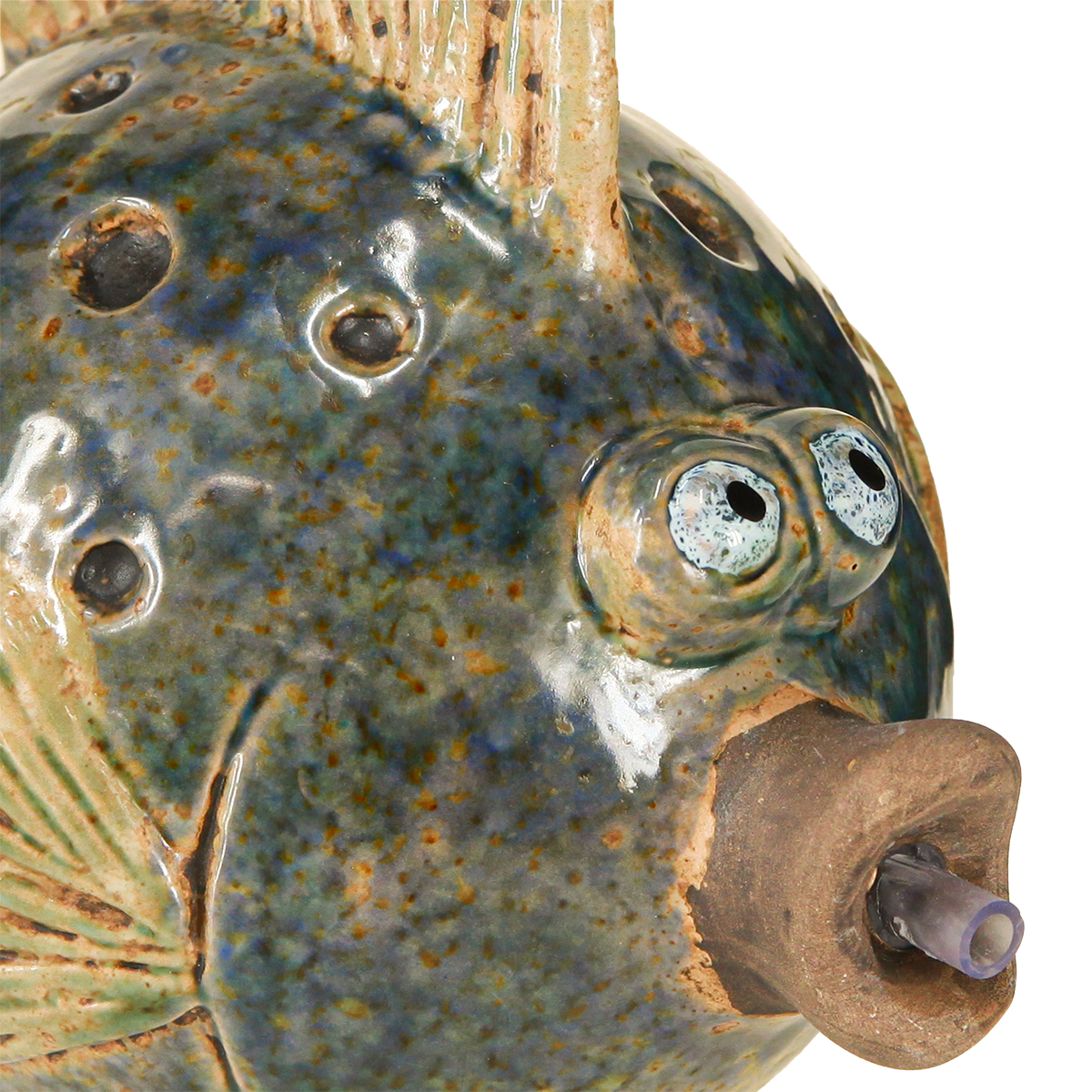 Az elbűvölő vízköpőfigura, mint vicces gömbhal, a művészi bájt a funkcionális dizájnnal ötvözi, és ideális a kert, az erkély vagy a terasz díszítésére. Ez a nosztalgikusan szép kék és barna tónusú szobor tökéletesen illeszkedik a tengeri dekorációs témákhoz. Körülbelül 20 × 11 × 13,5 cm-es méretével tökéletes méretet kínál vízi kertjének fénypontjaként. A kiváló minőségű kerámiából készült vízköpő különösen strapabíró és mérettartó, így ideális kültéri használatra a nyári hónapokban.