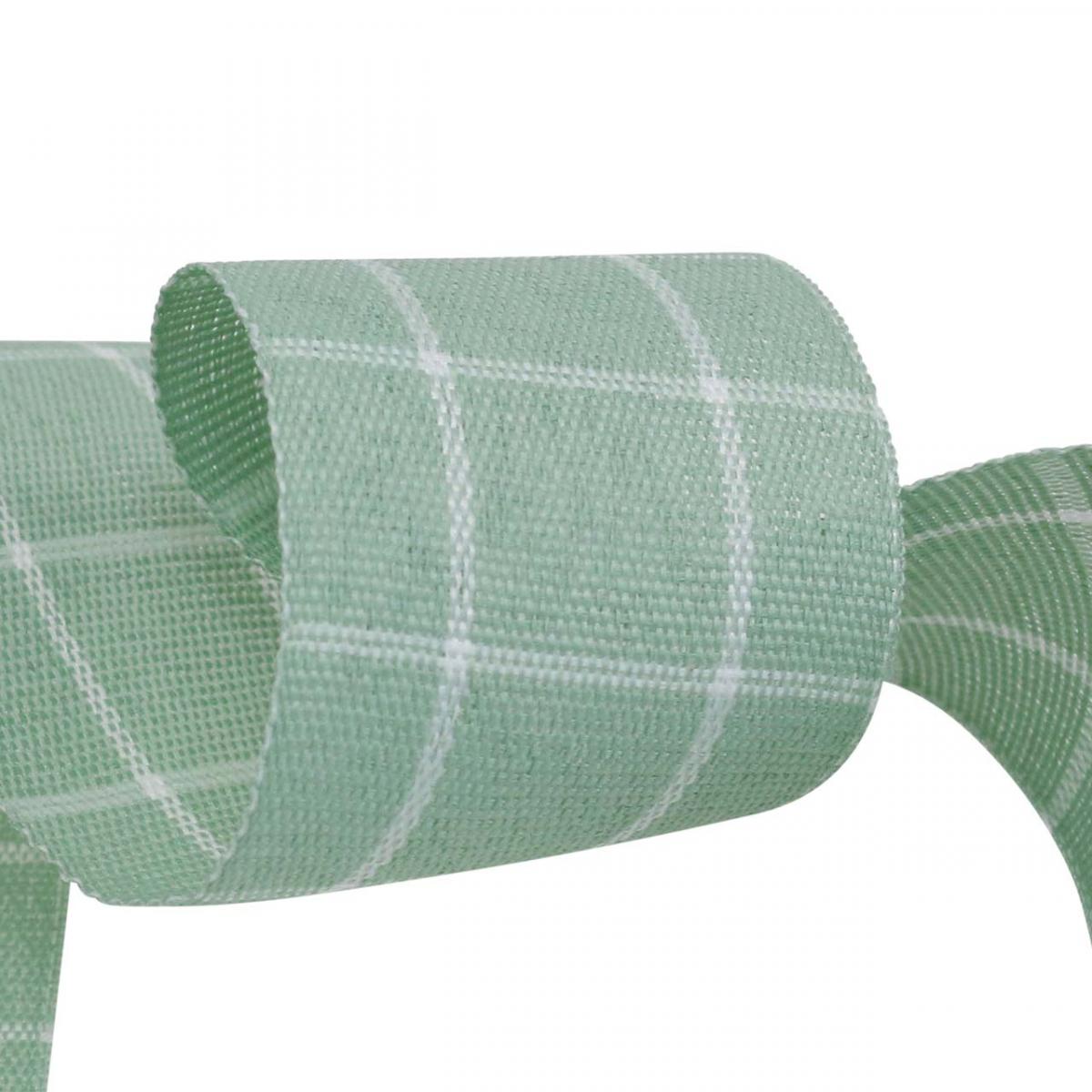 A pasztellzöld, széles díszszalagot fehér kockás minta díszíti. A szövés továbbra is látható, enyhén rusztikus hatást adva az ajándékszalagnak. Ennek ellenére a szalag nagyon exkluzívnak tűnik finom színének köszönhetően.