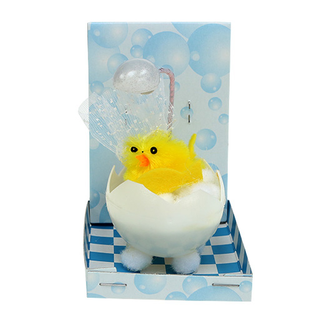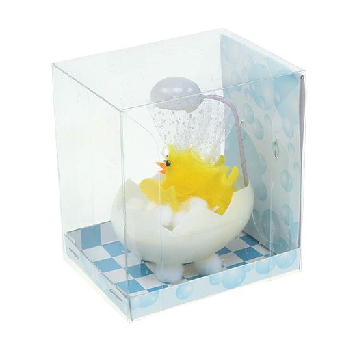 A fürdőszobában lévő sárga zsenília csaj 8,5 centiméter magas a karton kijelzővel, és a fürdőkádon kívül, amelyben fehér vattagolyókból készült hab úszik, van egy zuhanyfej is, amelyből az itt organza anyag által képviselt víz jön. ki. A halak, a sárga szárnyak és a narancssárga csőr filcből készültek, és a fürdőző húsvéti csaj elragadó képét teszik teljessé fekete szemekkel.